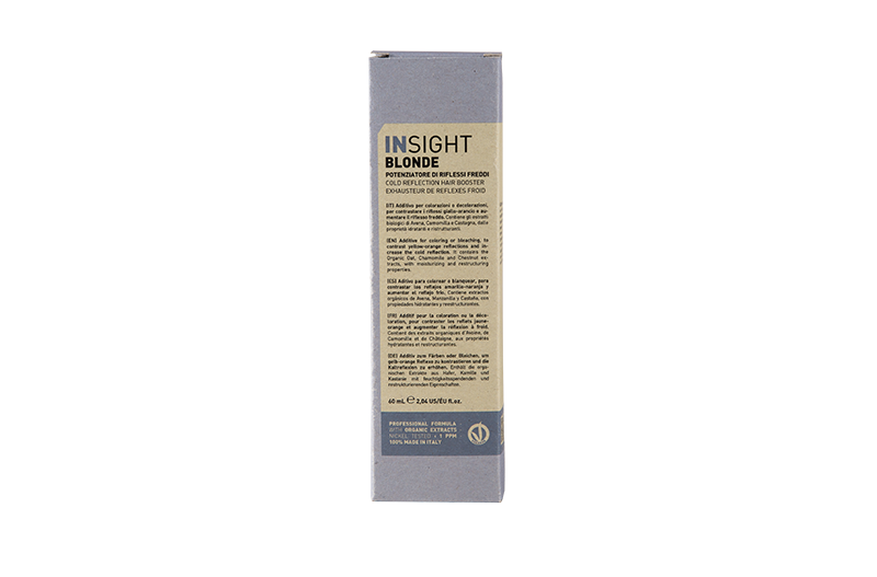 Additif pour la coloration ou la décoloration des cheveux. Une formule unique, qui peut être mélangée aux poudres décolorantes Insight ou aux teintes Incolor, pour personnaliser le service technique à chaque fois que vous souhaitez contraster les reflets jaune – orangé et sublimer le reflet cendré/froid Certification Végan OK ; Formules testées au nickel ; Parfum sans allergènes.
